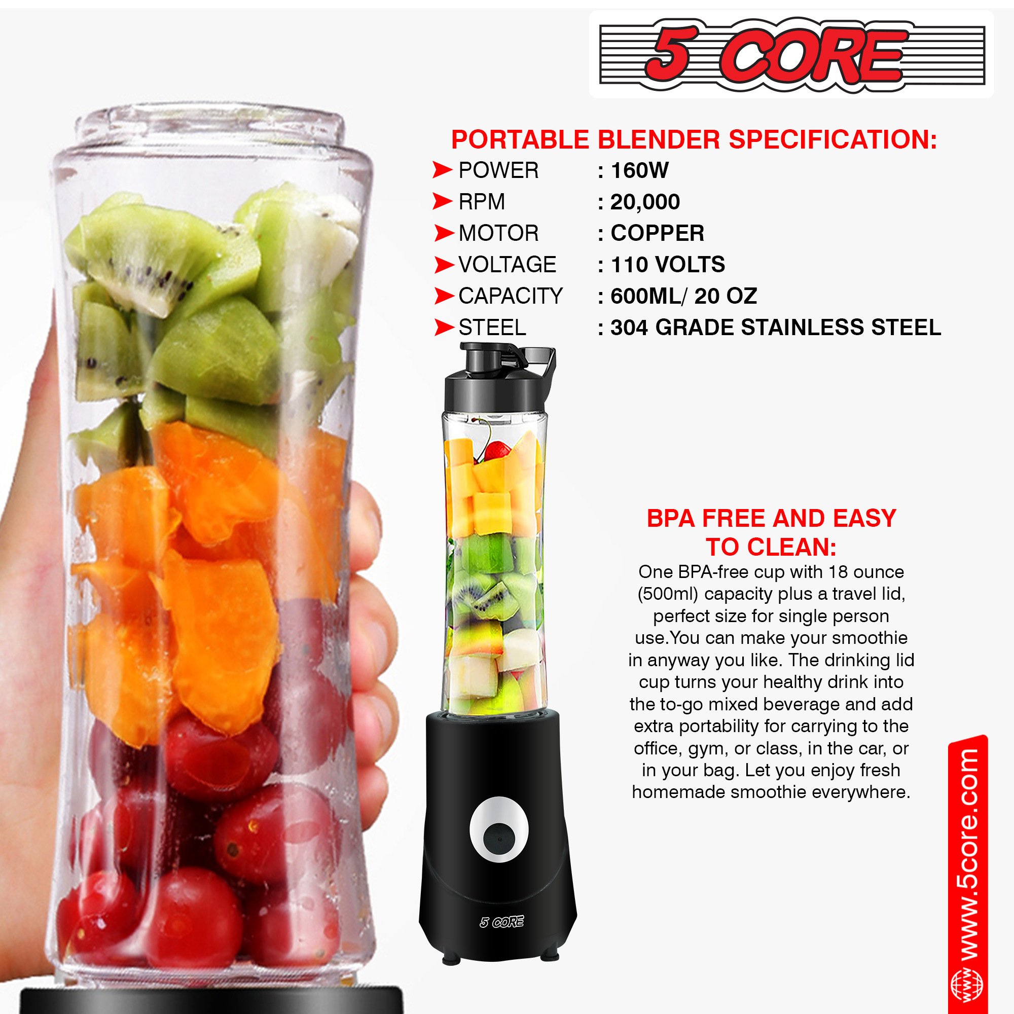 Are you looking for a compact and easy-to-use smoothie maker? Look no further! The 5 Core 160-Watt personal blender is dedicated to efficiency, user-friendliness, and portability. It comes with one bottle, perfectly suited for your busy lifestyle. This high-quality product excels at making daily smoothies, shakes, and morning protein drinks. At 5 Core, Customer satisfaction is our priority—a proven track record of delivering the highest quality product since 1984. |